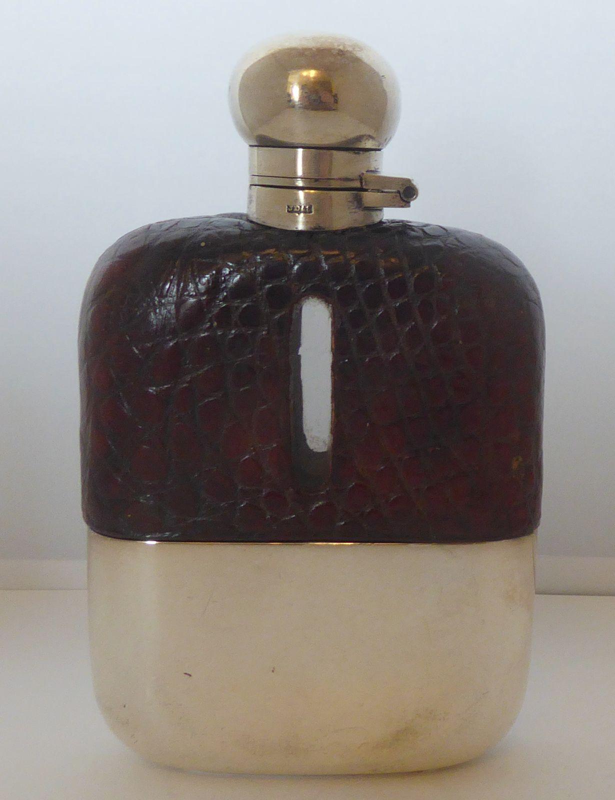 1900s 3/16 Pint Silver Plate Plated Crocodile Skin Glass Hip Flask James Dixon