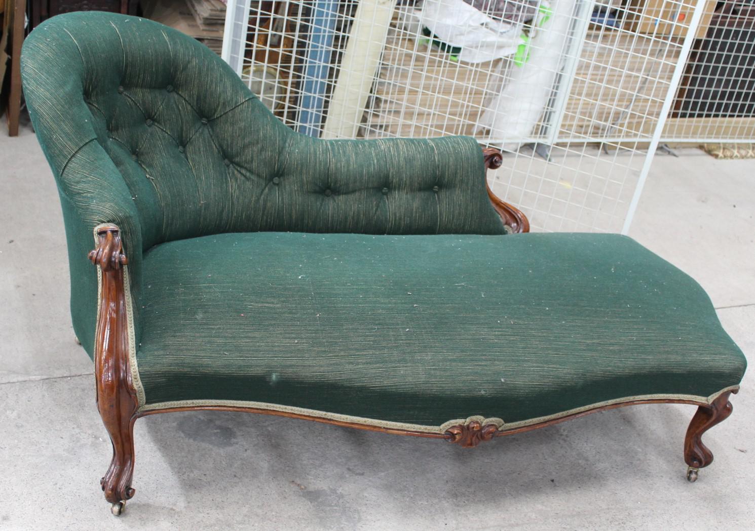 1900's Carved Mahogany Chaise with Buttoned Back in Green