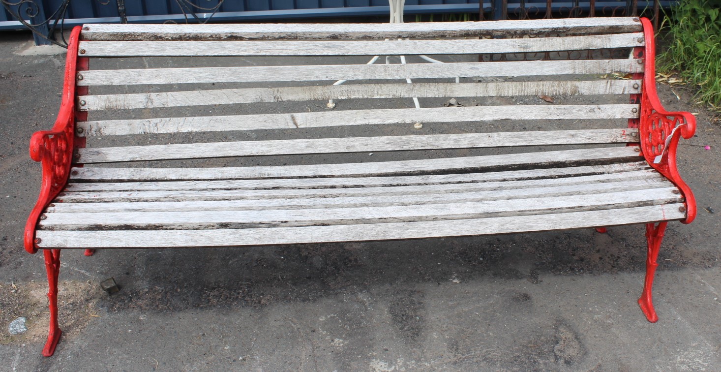 1900s Cast Iron Garden Bench Painted Red Ends.(1)