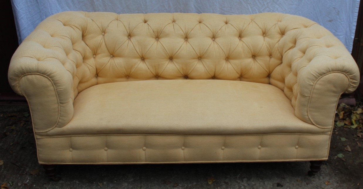 1900s Early 3 Seater Mahogany Chesterfield Sofa in Pale Yellow Upholstery