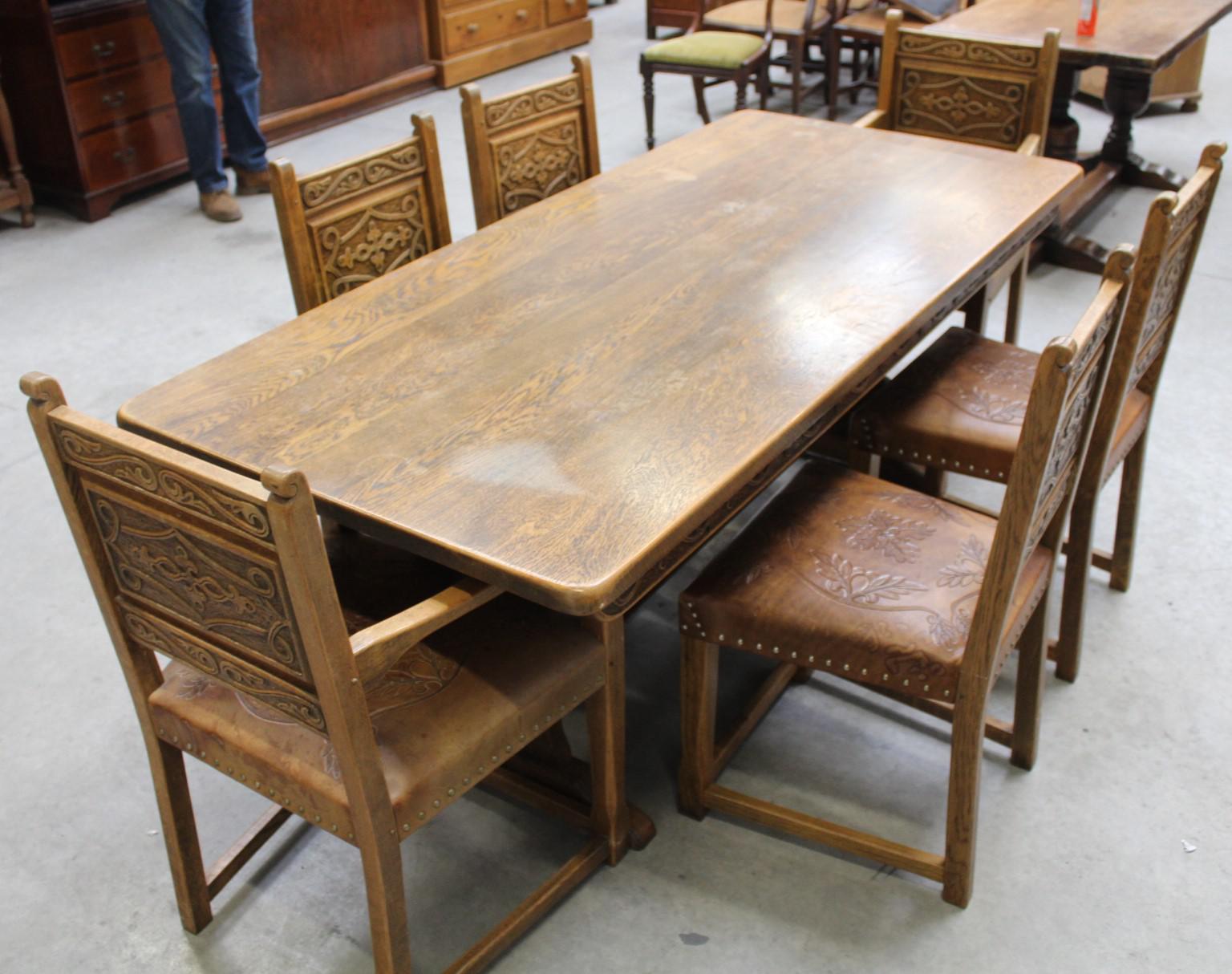 1900's French Oak Refectory Table with Set 6 Oak Chairs +Leather Embossed Seats.