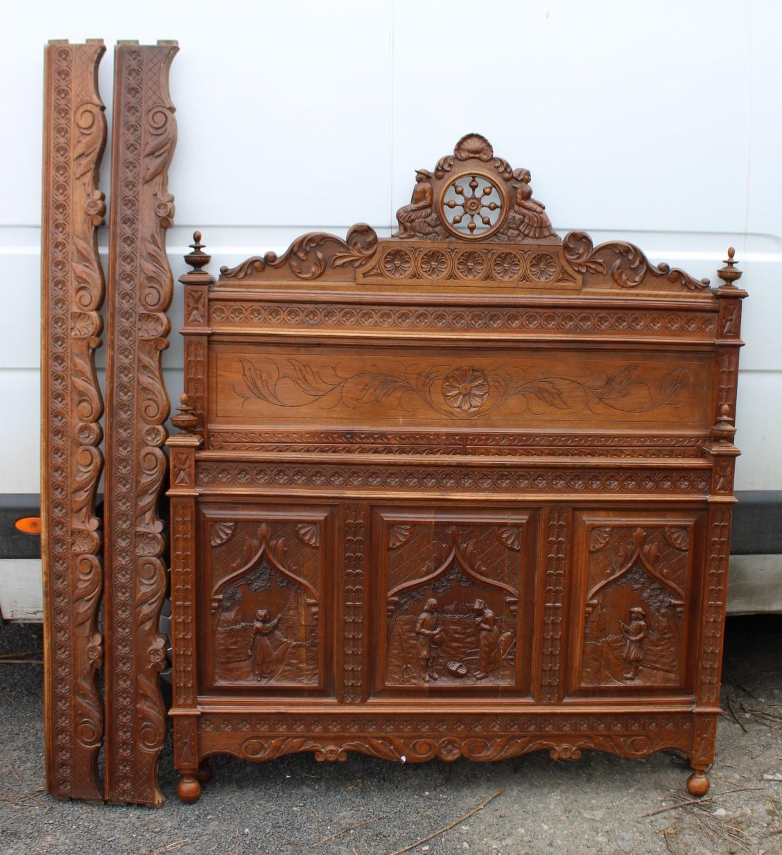1900s Large Double Oak Breton Bed Frame with 3 Carved Panels in Base