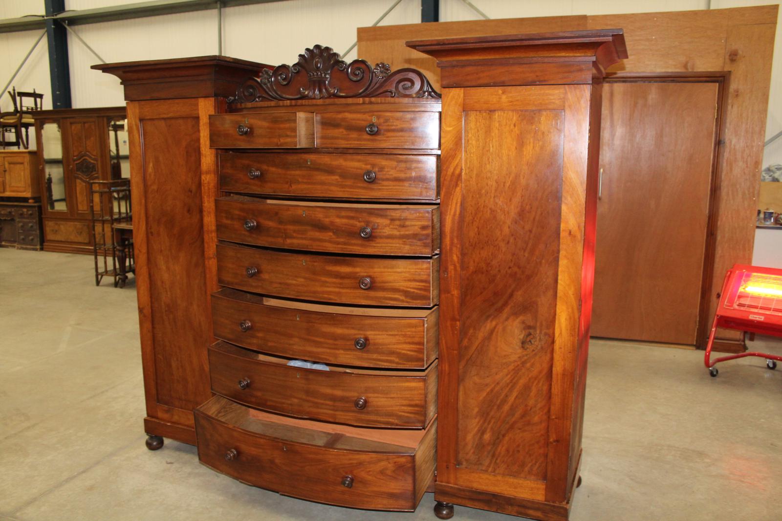 1900s Large Mahogany Bow Front Wardrobe with Drawers