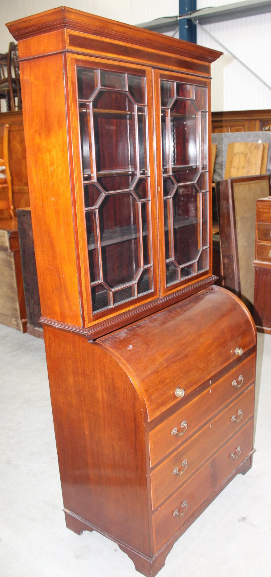 1900's Large Mahogany Cylinder Bureau Bookcase with Key