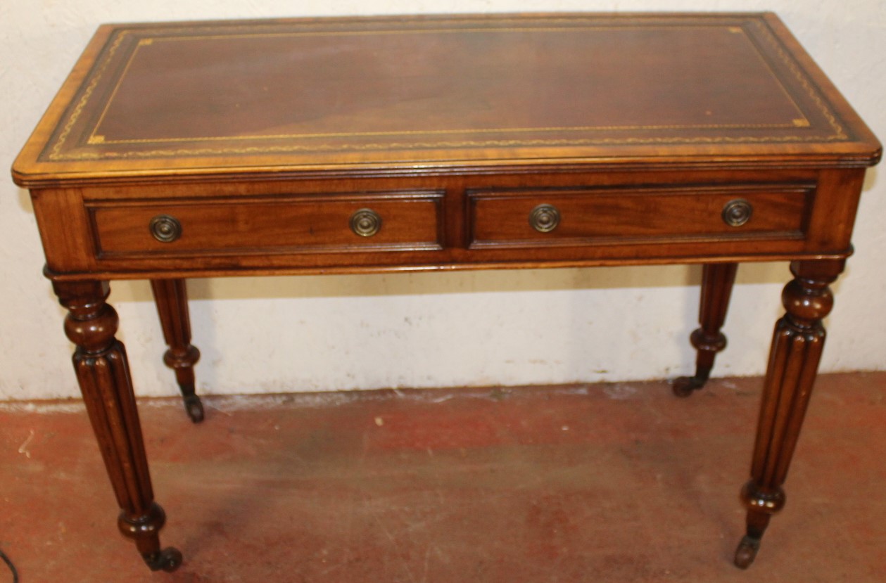 1900s Mahogany 2 Drawer Table with Red Leather Inset on Fluted Legs