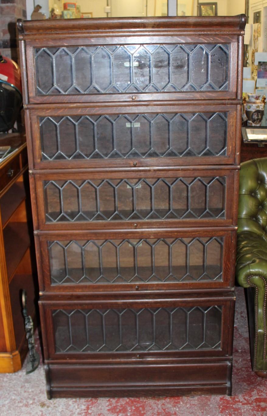 1900's Oak 5 Stacker Globe Wernicke with Lead Glass Doors + Metal Banding
