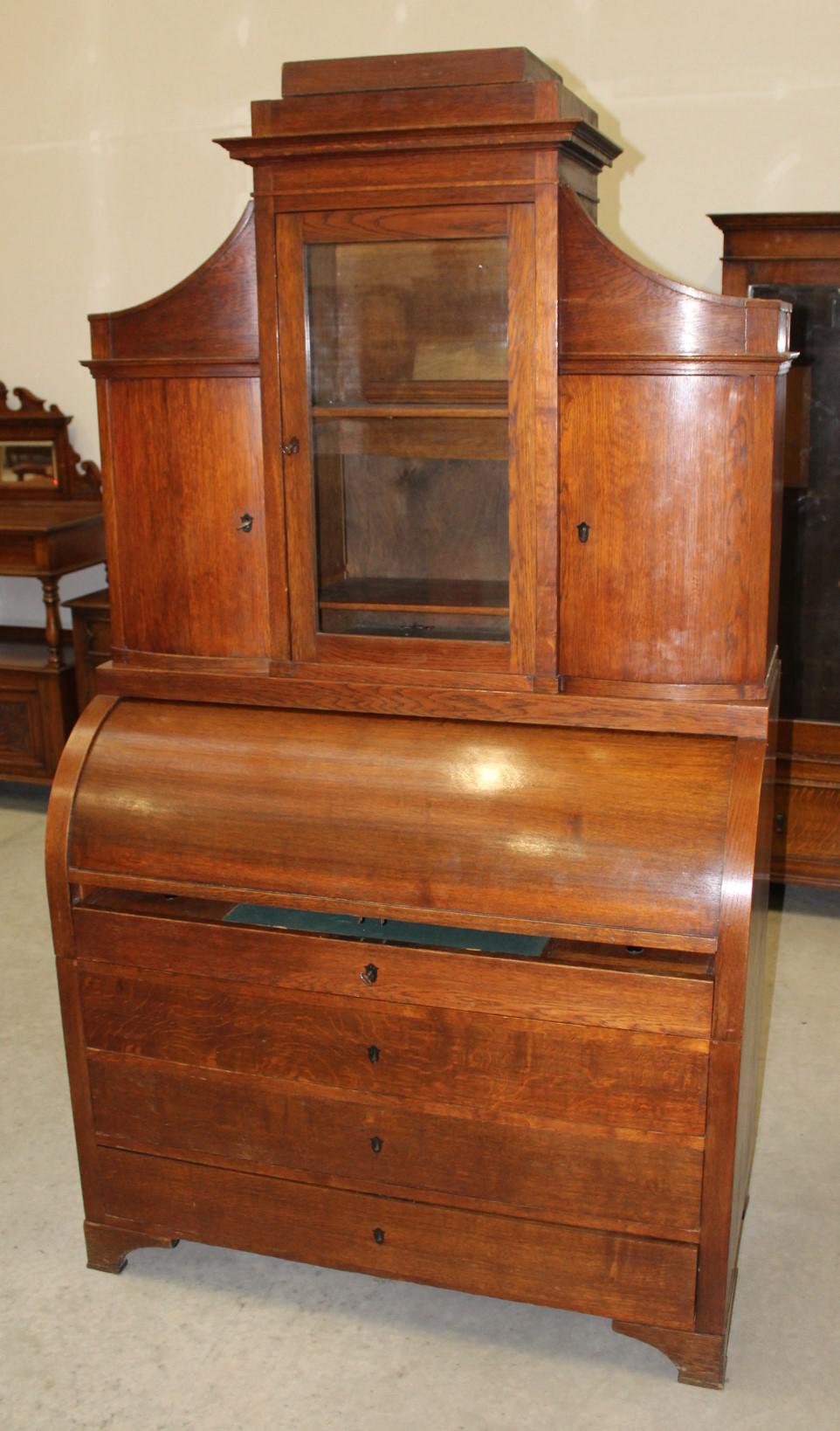 1900's Oak Cylinder Desk with Inlay and Display Top. Good Interior