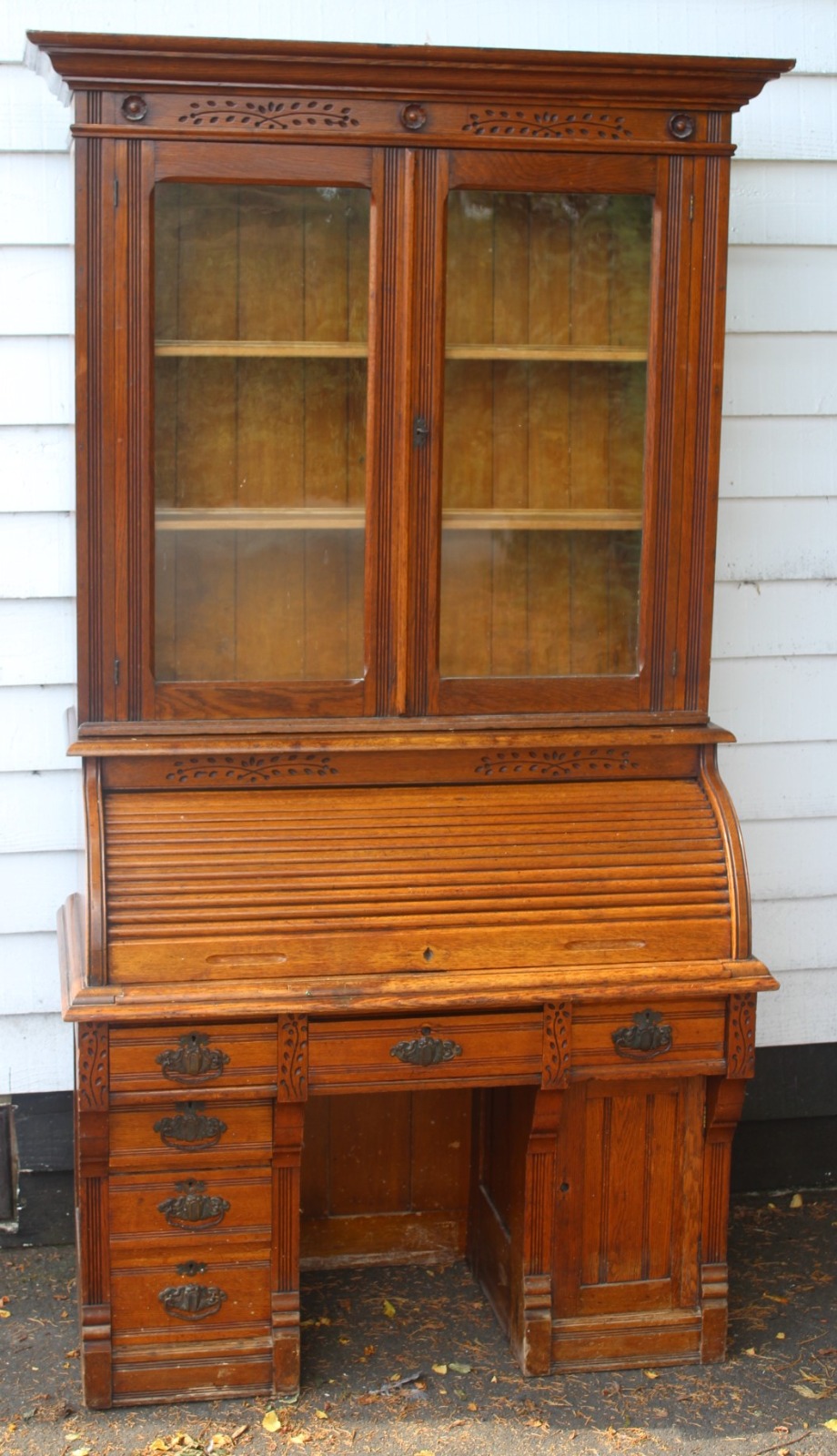 1900s Oak Rolltop Desk with Double Glazed Door Bookcase