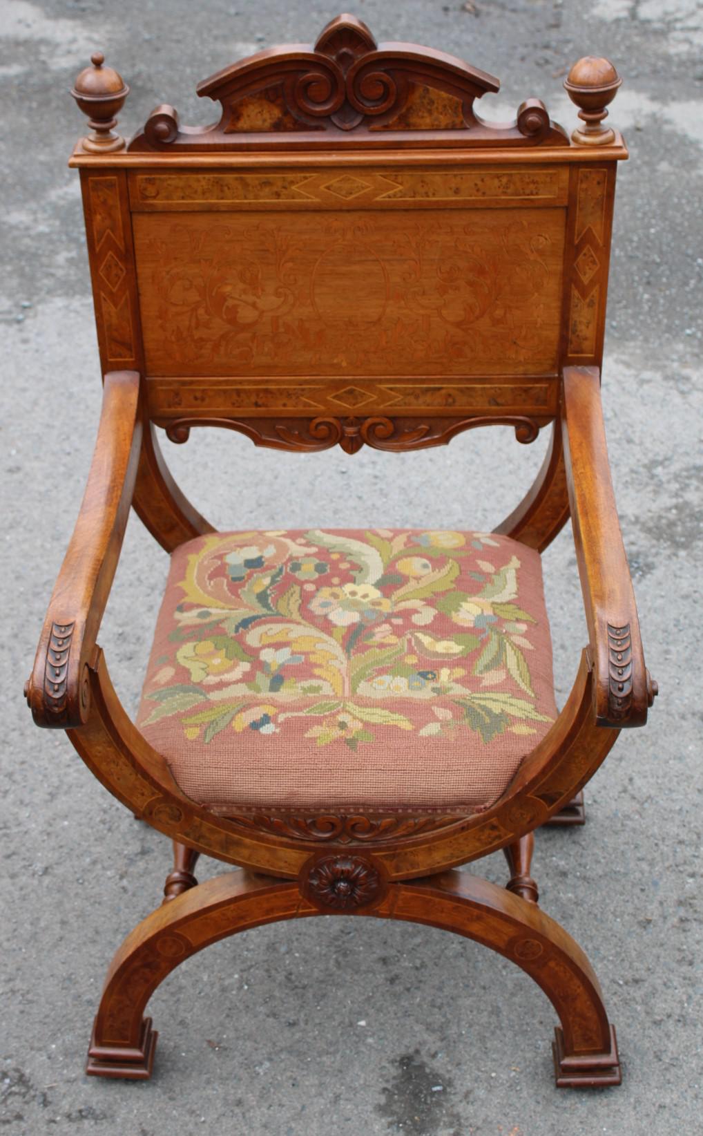 1900's Quality Walnut X Chair with Inlay & Pretty Upholstered Seat