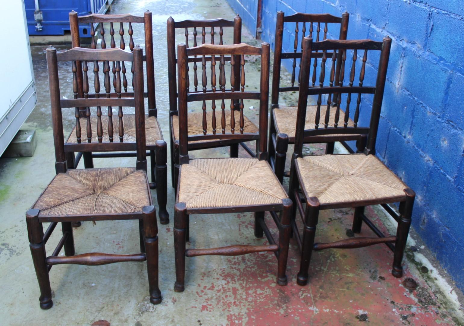 1900s Set 6 Oak Spindleback Chairs Rush Seats