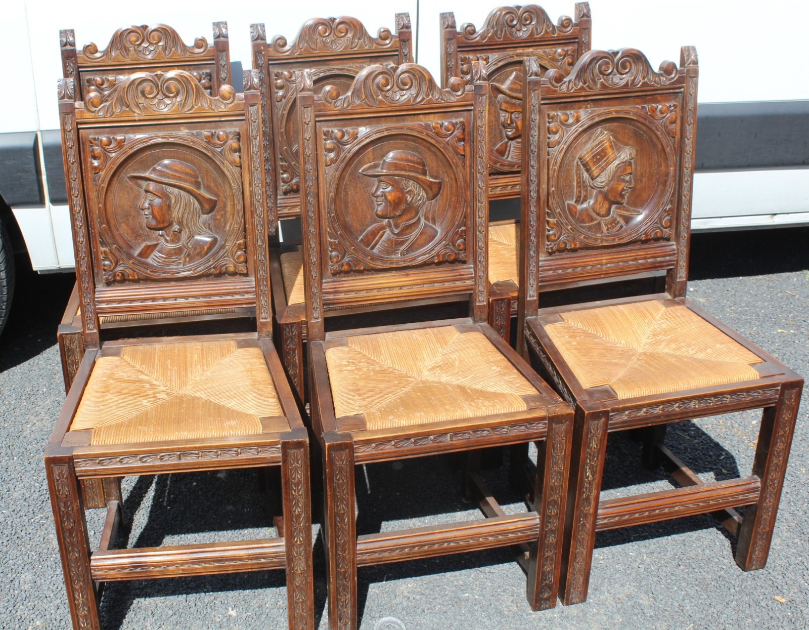 1900s Set of 6 Breton Oak Dining Chairs with Carved Motif on Backs Rush Seats