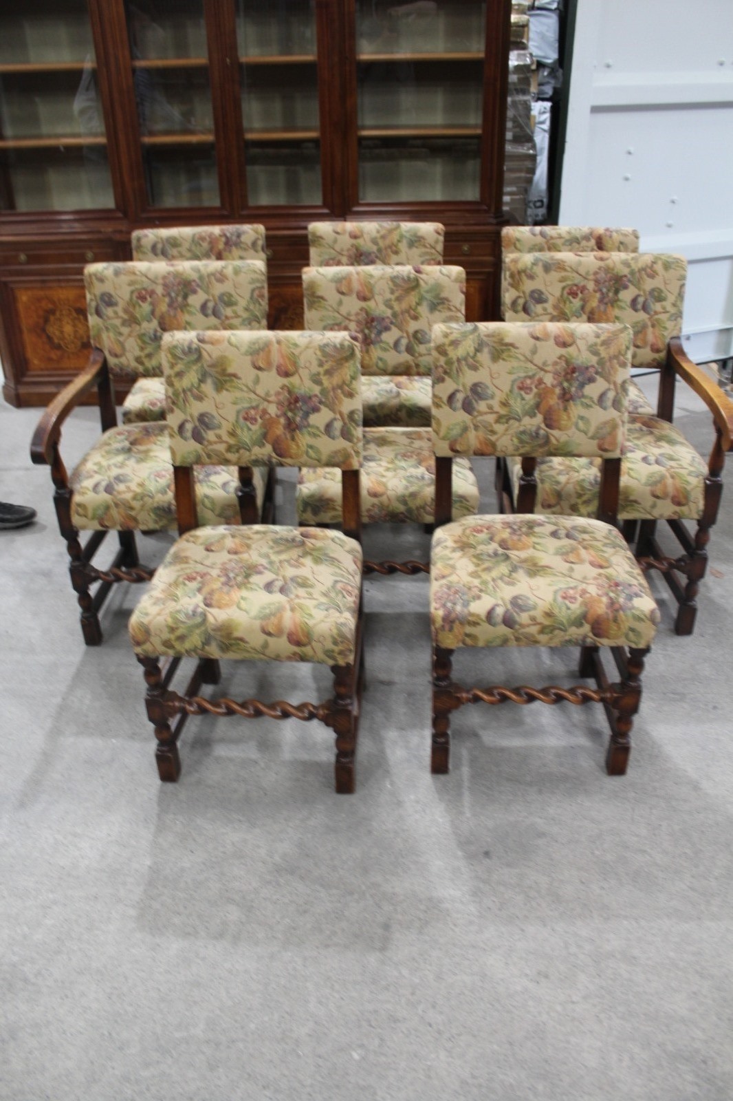 1900s Set of 8 Oak Barley Twist Chairs in Floral Upholstery. 6 + 2 Carvers