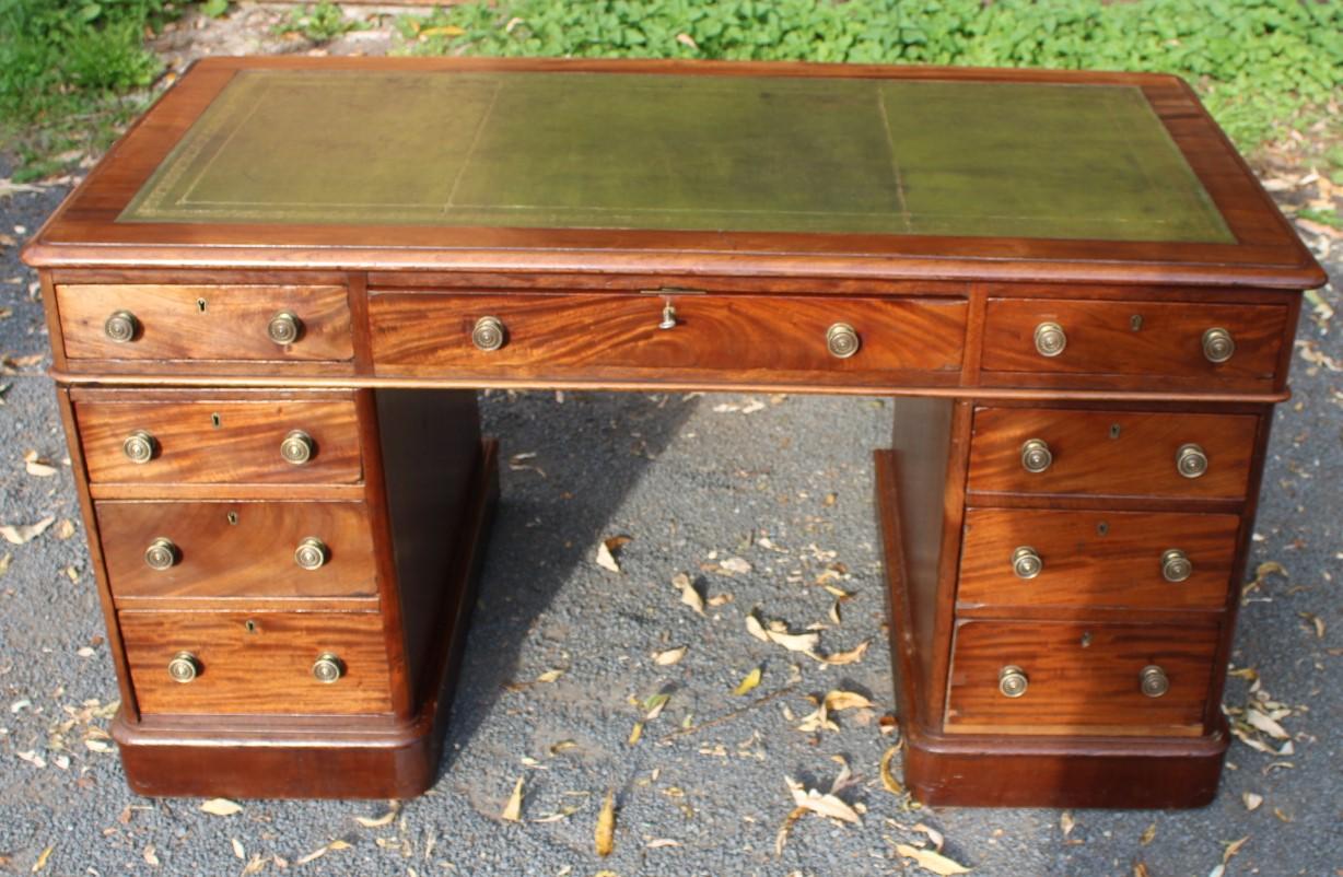 1900s Solid Mahogany Pedestal Desk with Green Leather Inset on Top