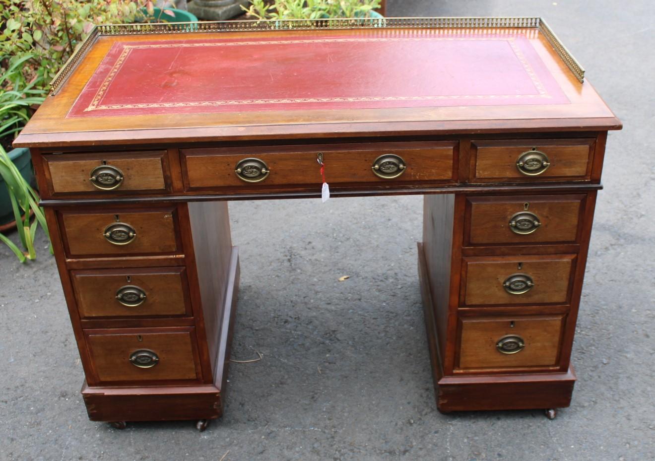 1900s Solid Mahogany Pedestal Desk with Red Leather & Brass Gallery
