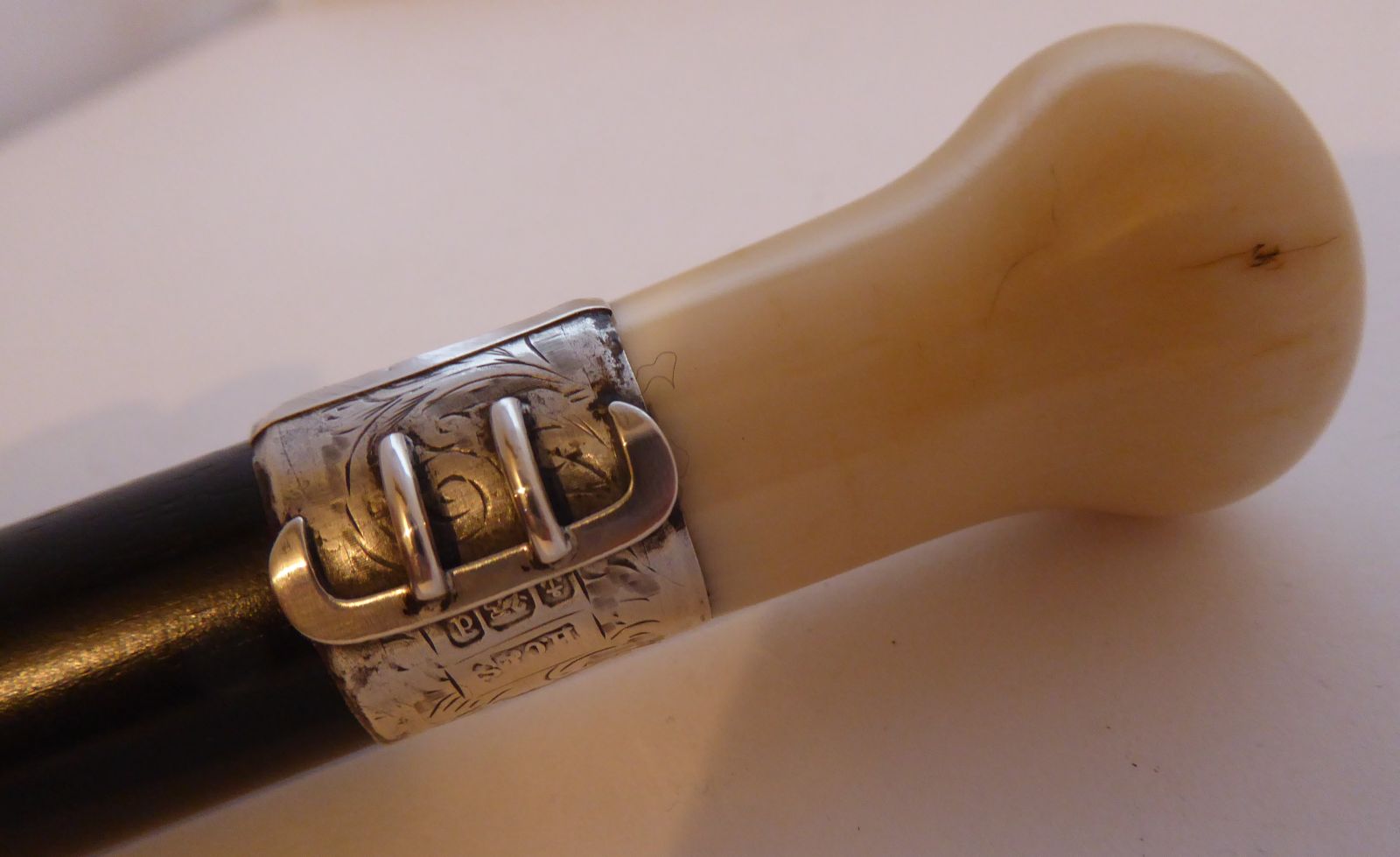1903 Walking Stick Cane Ivory Pommel Solid Silver Collar Ebony Wood Shaft