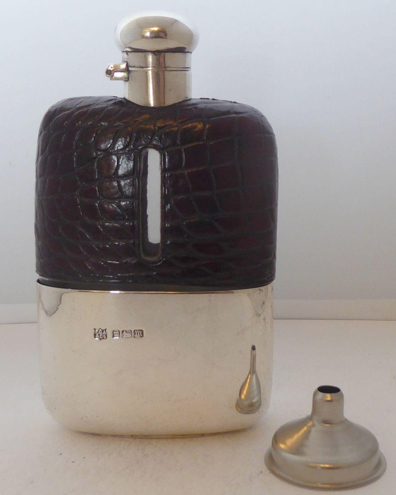 1904 Hallmarked Solid Silver Crocodile Skin Bound Glass Hip Flask 1/5th Pint