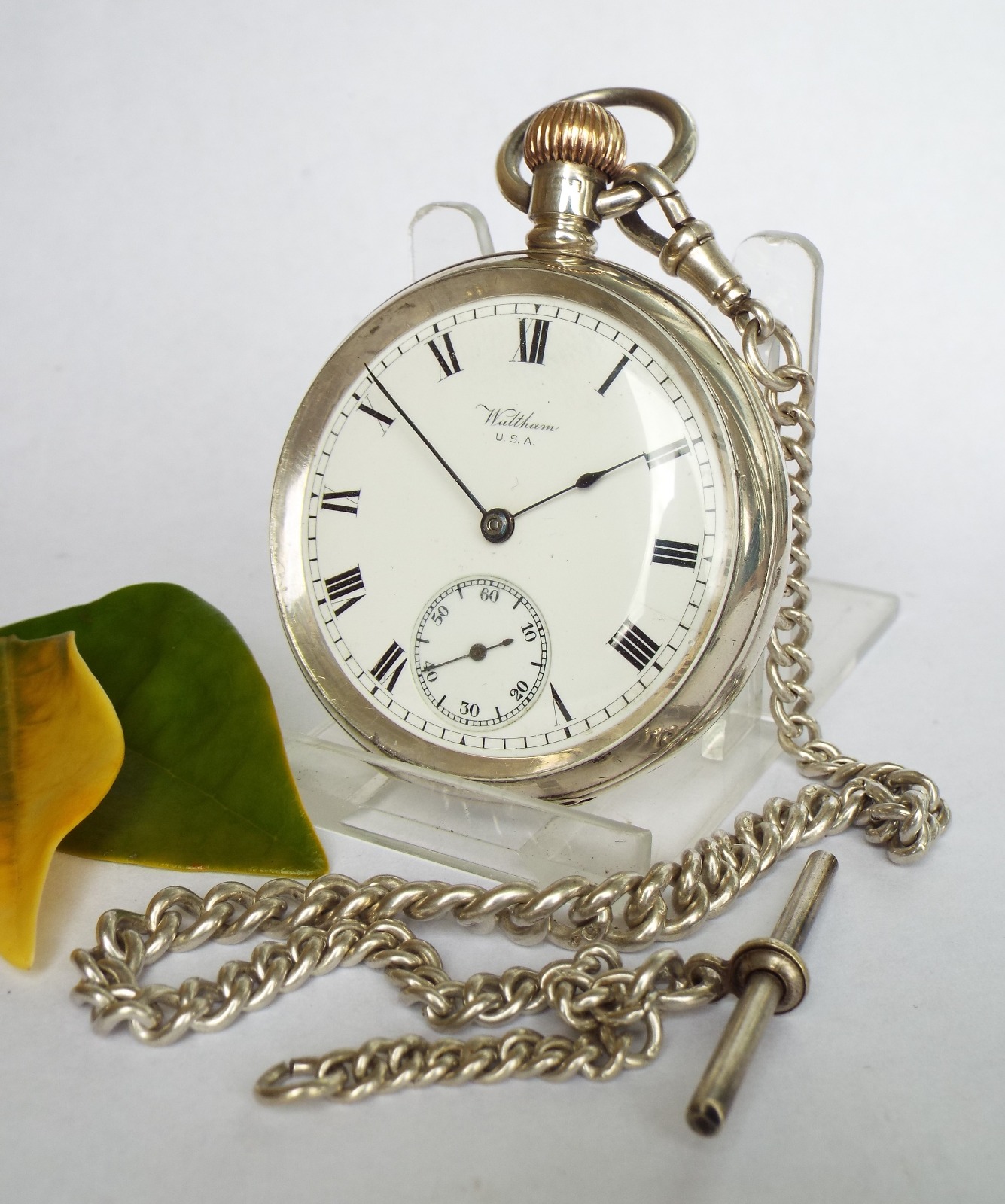 1909 Silver Waltham Marquis Pocket Watch & Chain