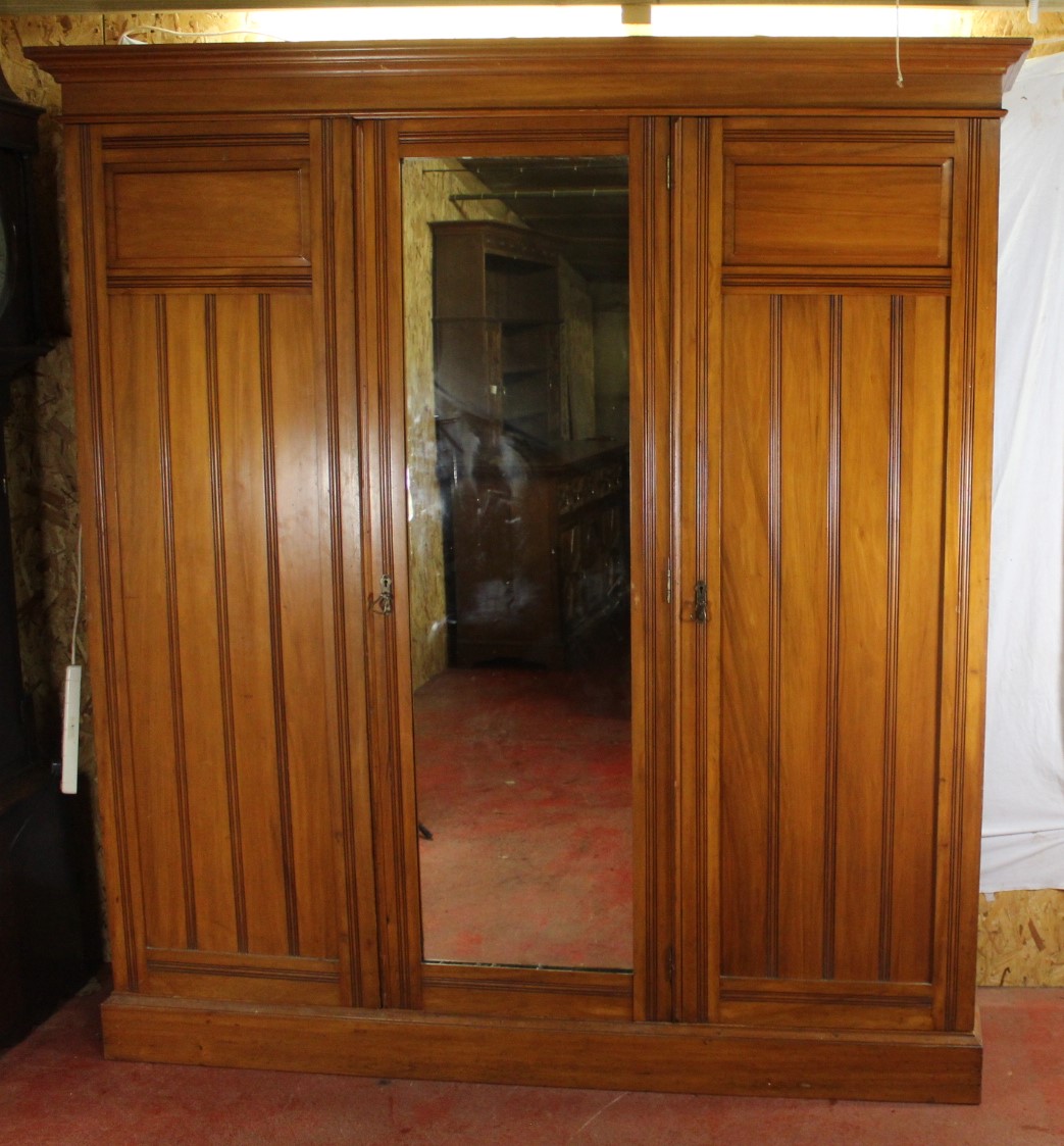 1910 Satin Walnut 3 Door Mirrored Compactum Wardrobe Good Interior