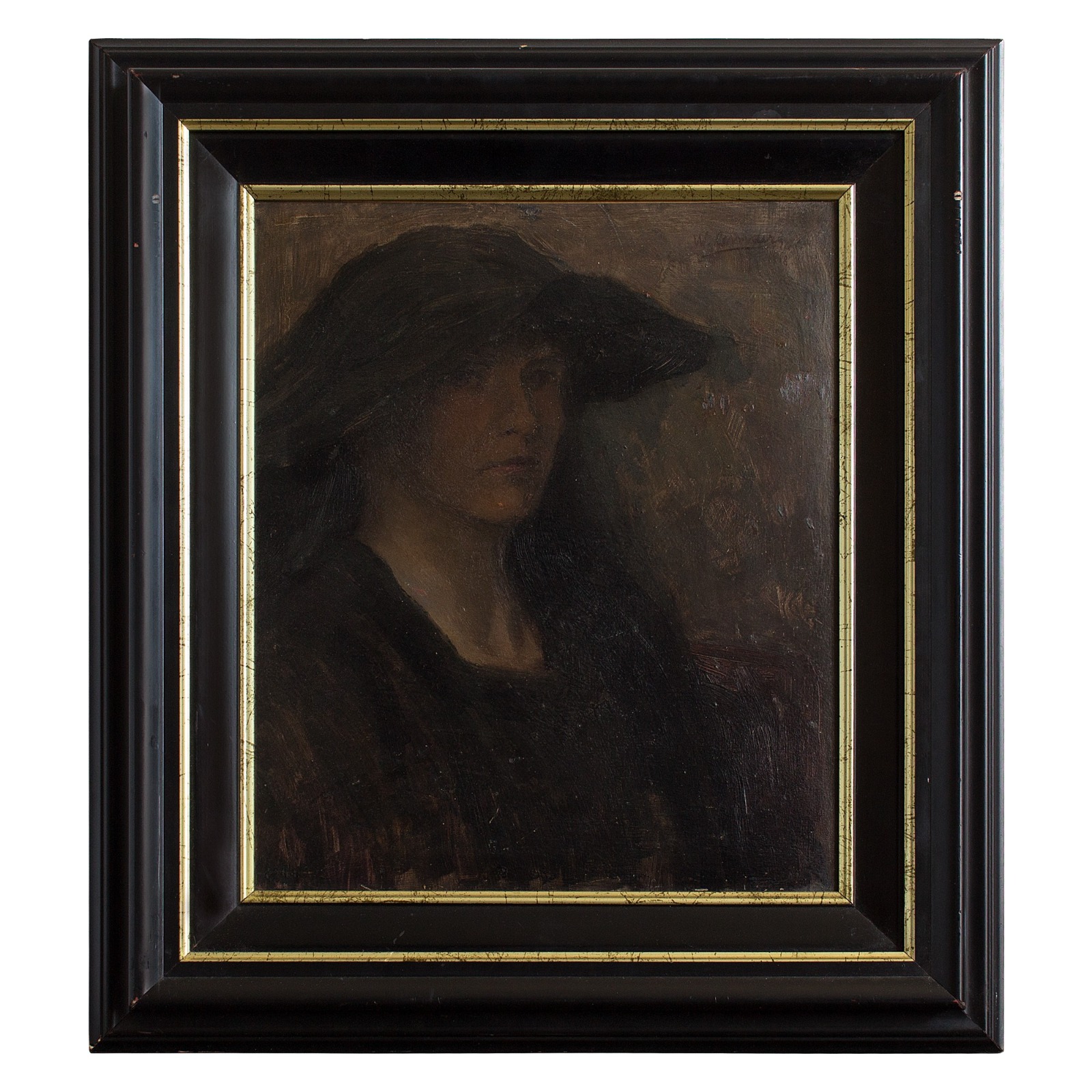 1910s Antique Oil Painting, Dark Portrait of a Lady in a Hat