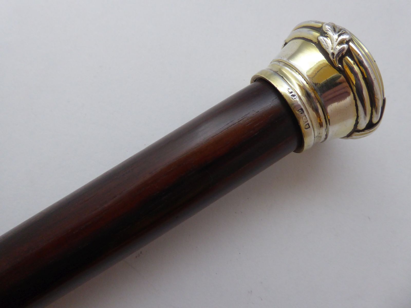 1911 Walking Stick Cane Hallmarked Solid Silver Gilt Pommel Rosewood Shaft