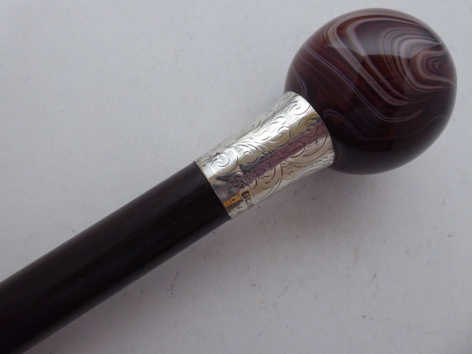 1920 Walking Stick Cane Solid Silver Collar Agate Pommel Rosewood Shaft