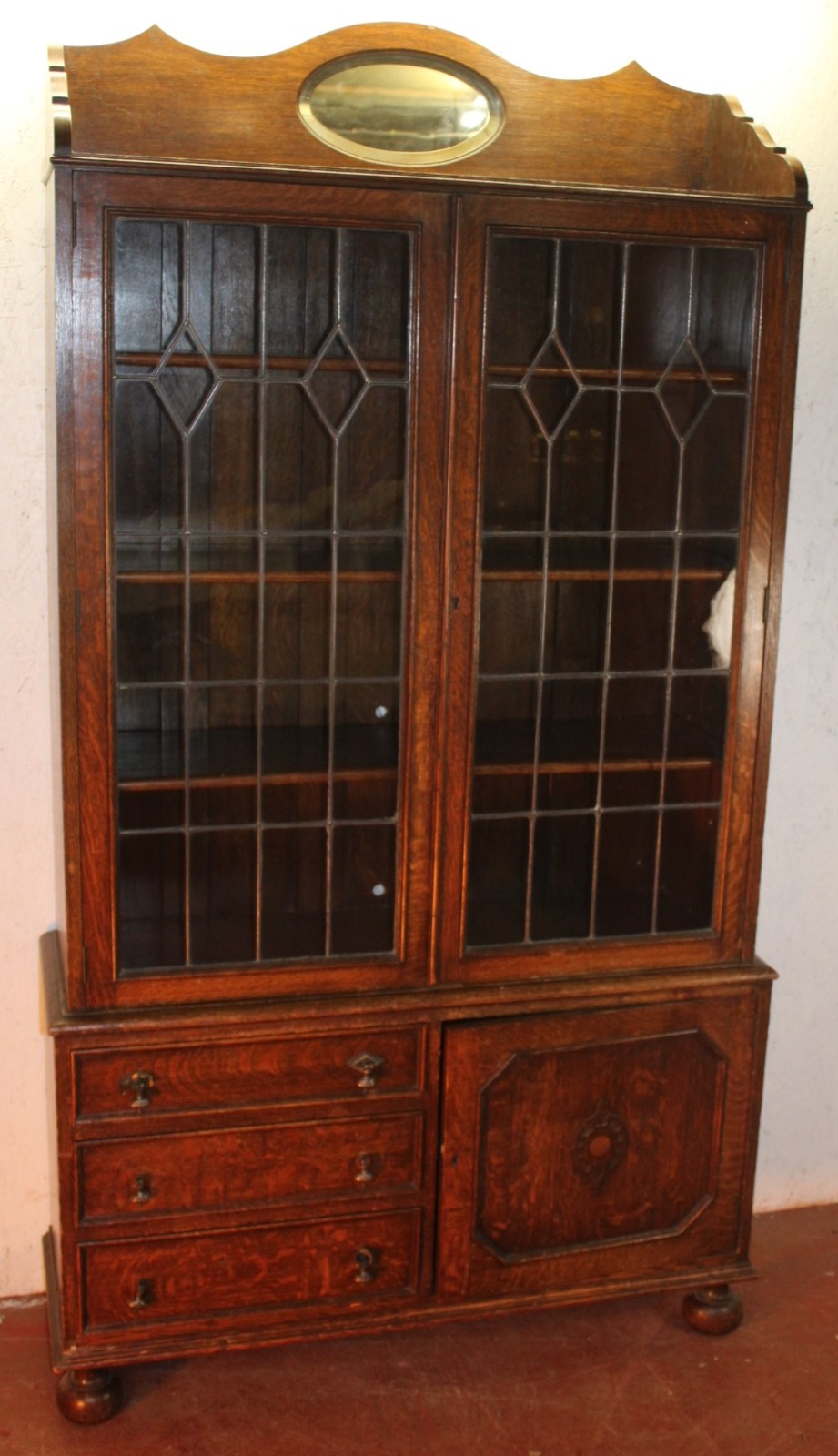 1920s 2 Door Oak Cabinet with Lead Glass Doors