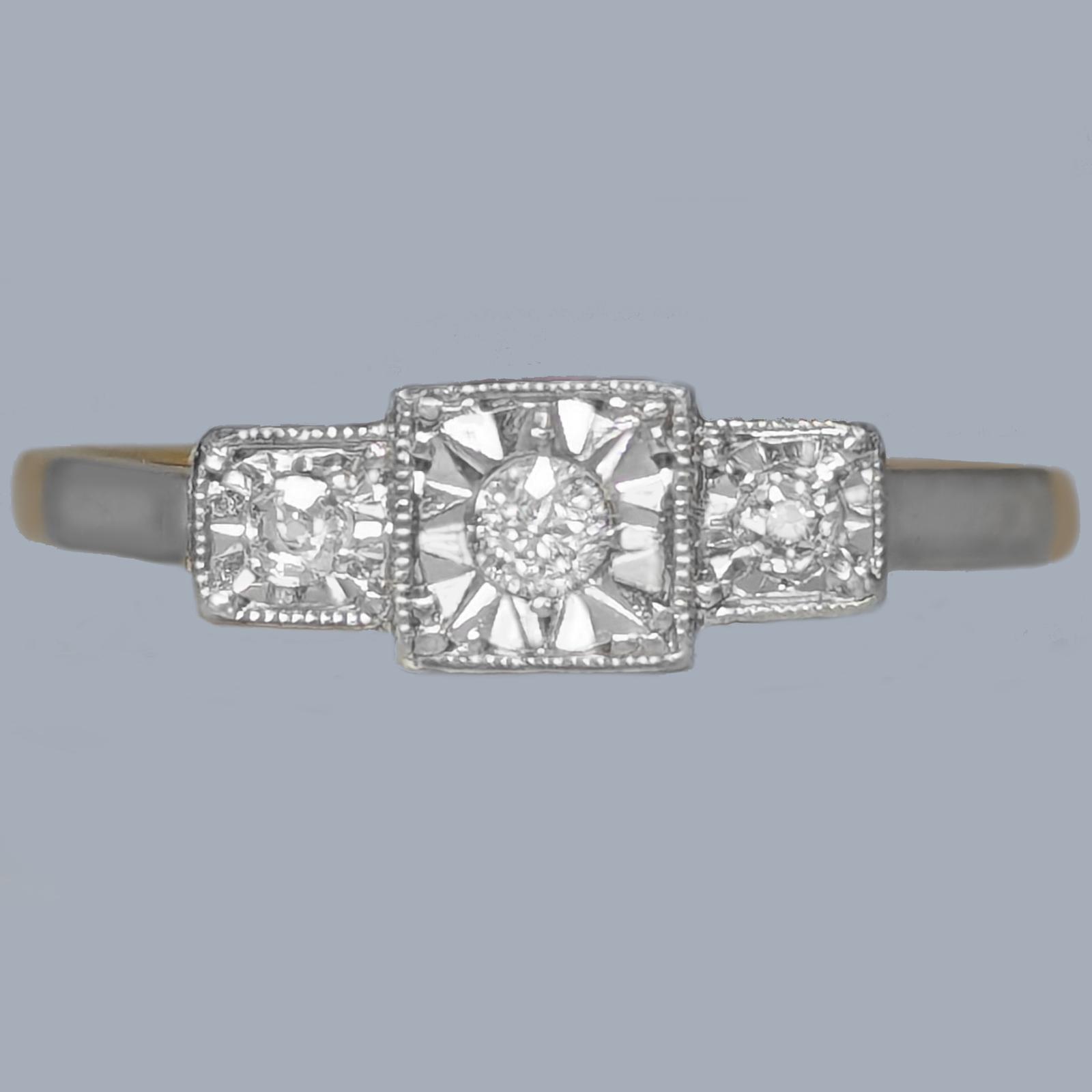 The three diamonds are set within finely chiselled star-shaped illusion mounts, a hallmark of the era, designed to reflect light and enhance the apparent size and brilliance of each stone. The central diamond is flanked by two smaller stones, forming a classic trilogy design symbolising past, present and future.