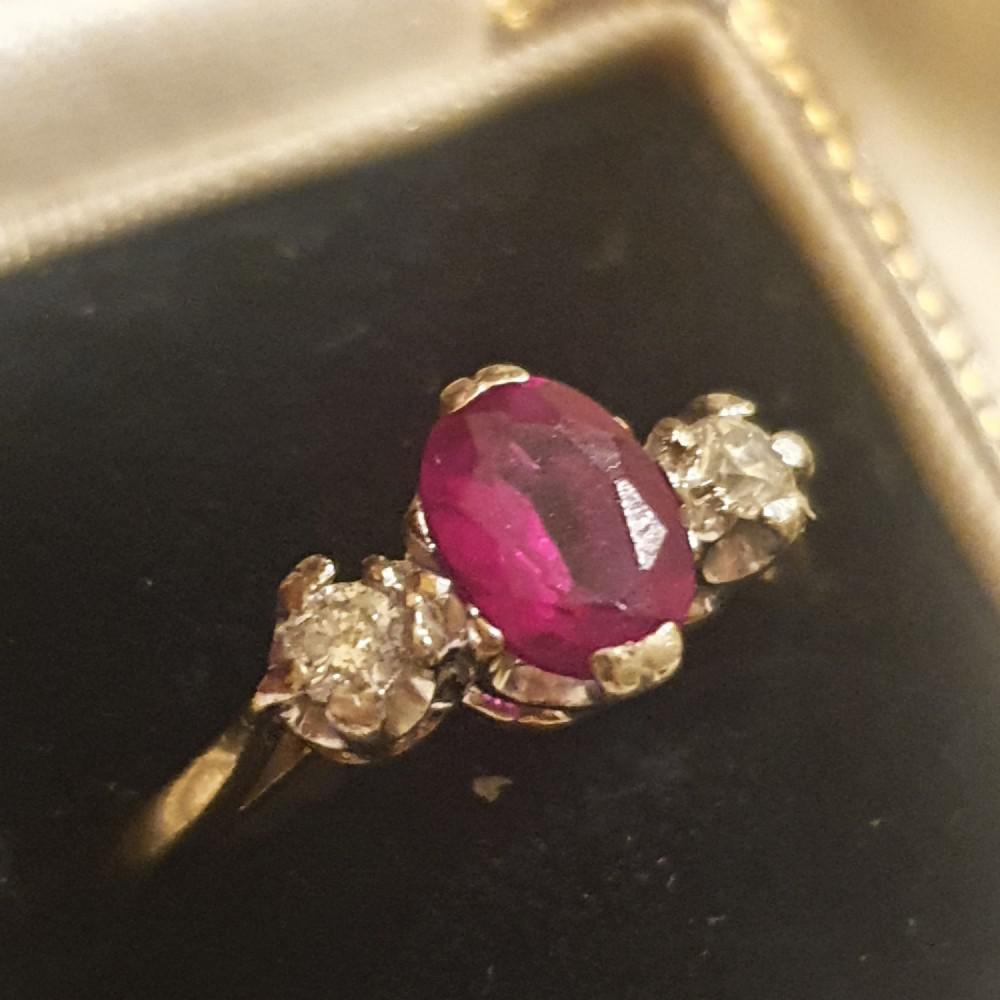 1920s Art Deco Synthetic Ruby & Brilliant Diamond Gold Trilogy Ring