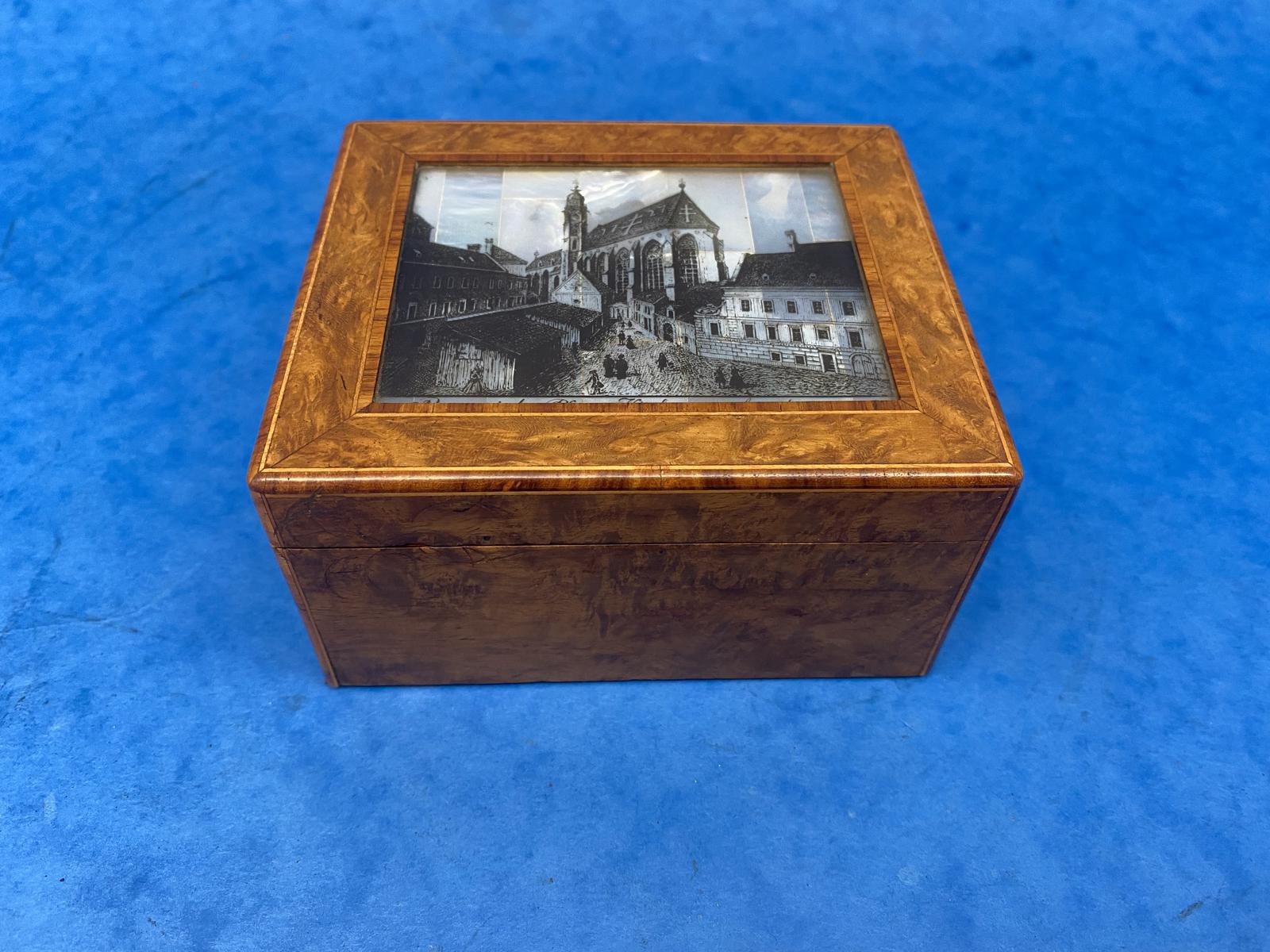 1920s Burr Cedar Box with Engraved Mother of Pearl Panel to the Top of a Cathedral