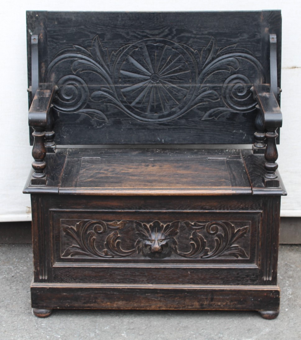 1920s Carved Dark Oak Monks Bench