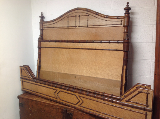 1920s French Birdseye Walnut & Mahogany Faux Bamboo Double Bed