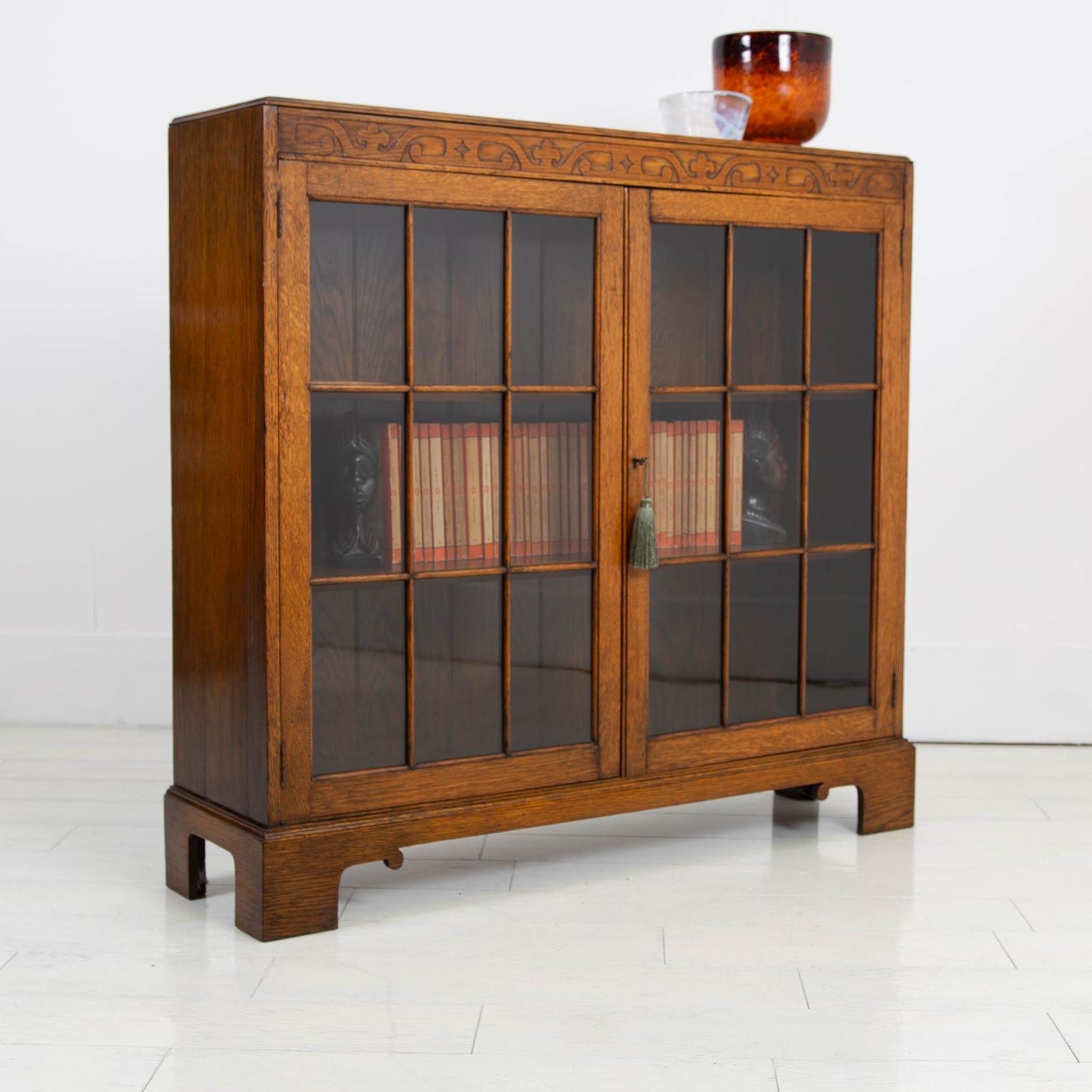 1920s Golden Oak Glazed 2 Door Bookcase Cabinet with Key (1 of 13)