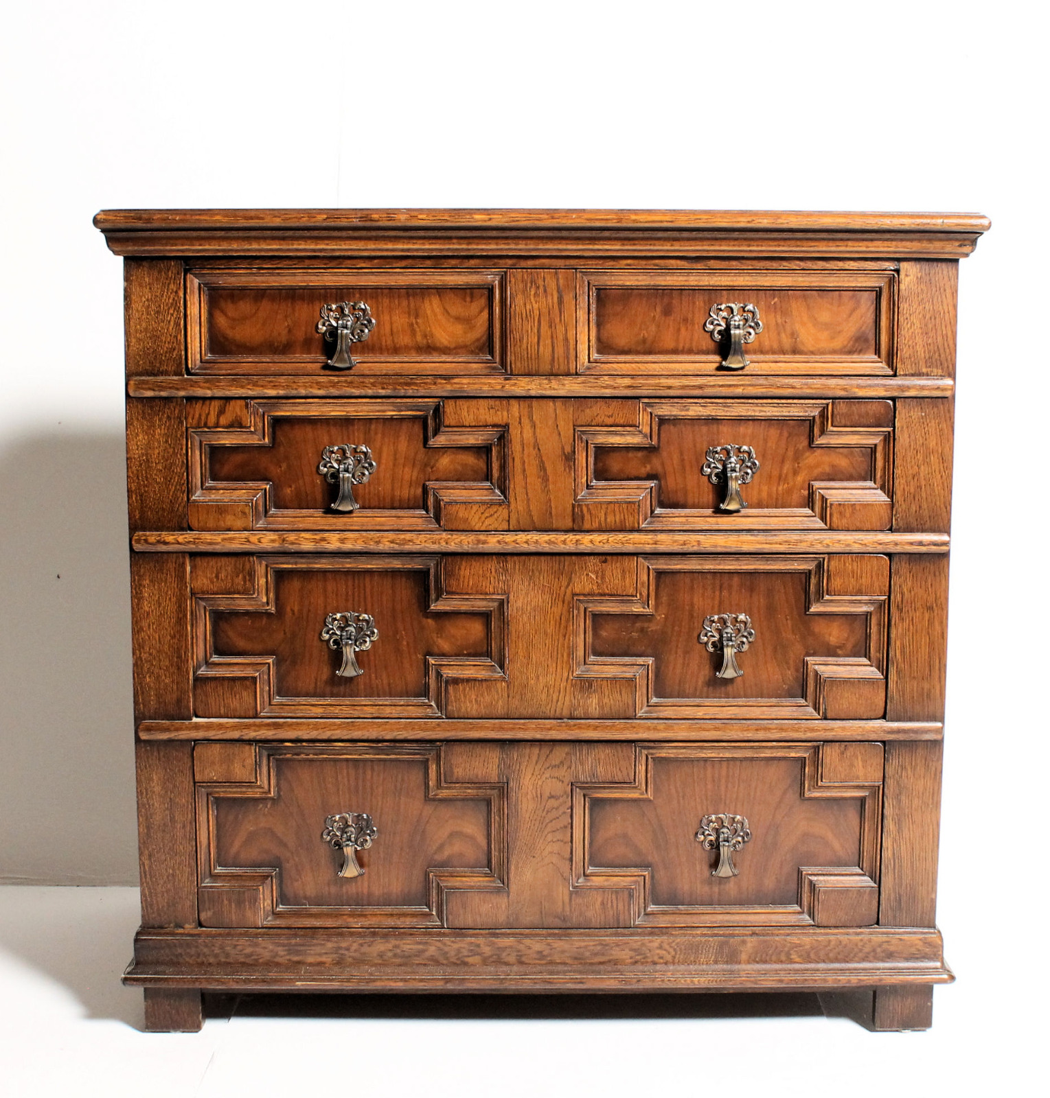 1920s Jacobean Style Solid Oak Moulded Chest of Drawers with Walnut Panels