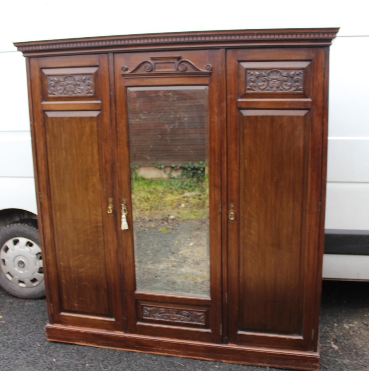 1920s Large Oak 3 Door Mirrored Wardrobe