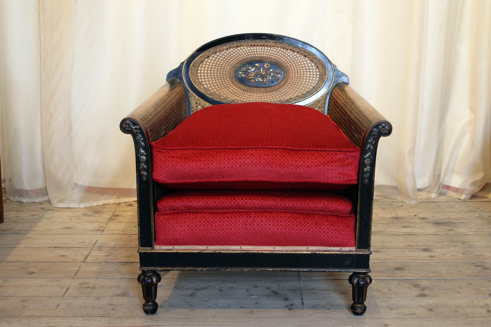 1920s Louis XVI Style Ebonised Bergere Armchair with Oval Back & Flower Details