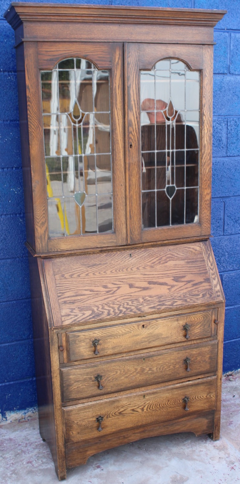 1920s Oak Bureau Bookcase with Lead Glass Doors