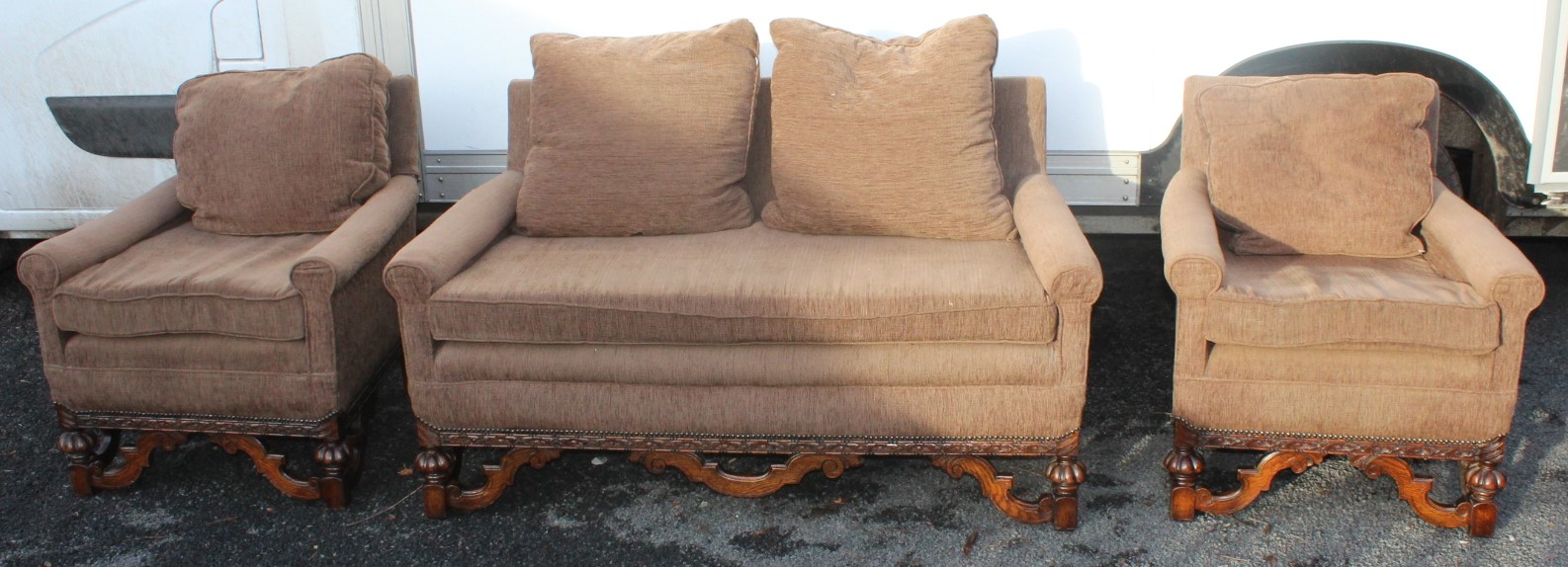 1920s Oak Framed 3 Piece Suite in Brown Upholstery