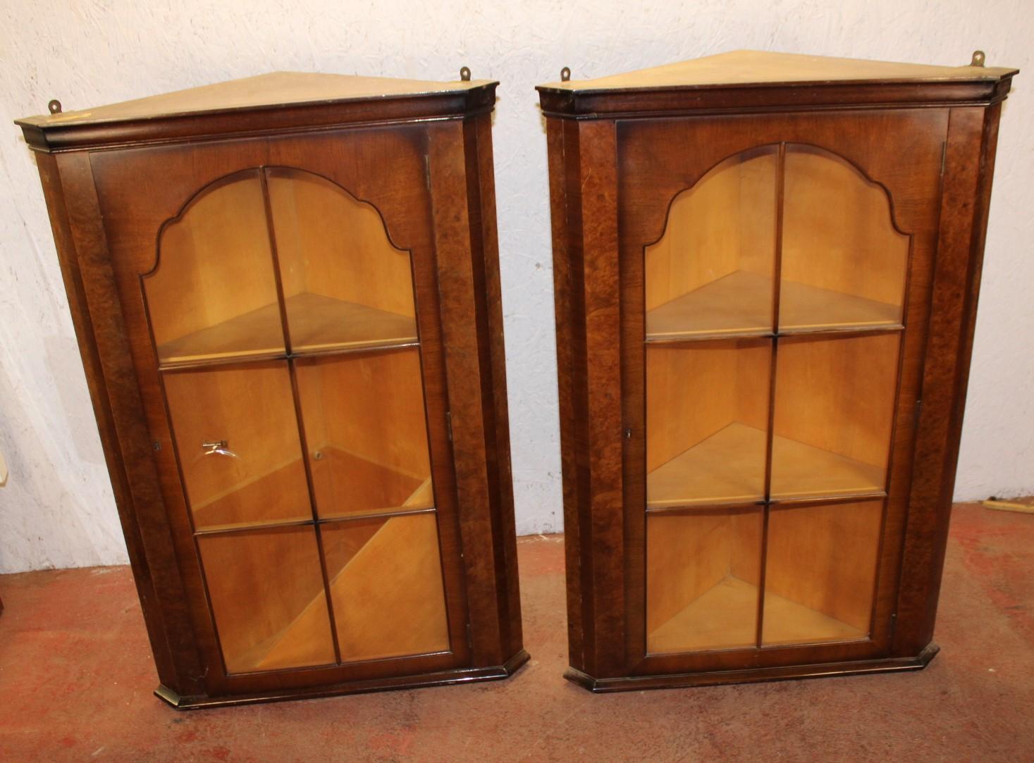 1920s Pair of Mahogany Glazed Hanging Corner Cabinets with Keys