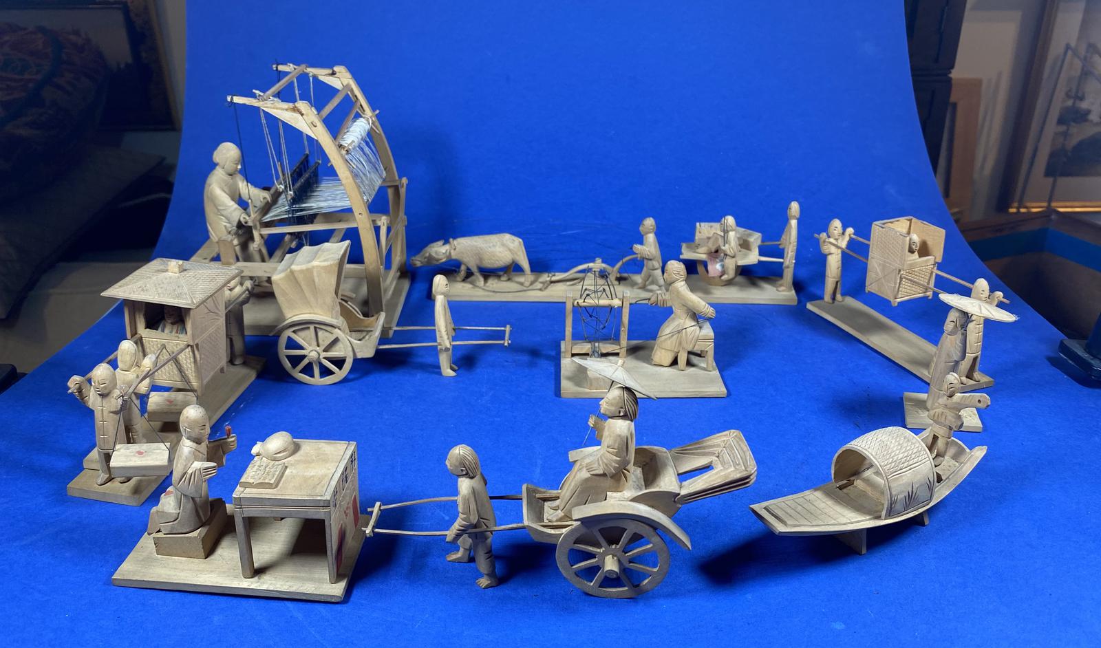 1920s Pine Box Containing 12 Carved Sandalwood Chinese Figures