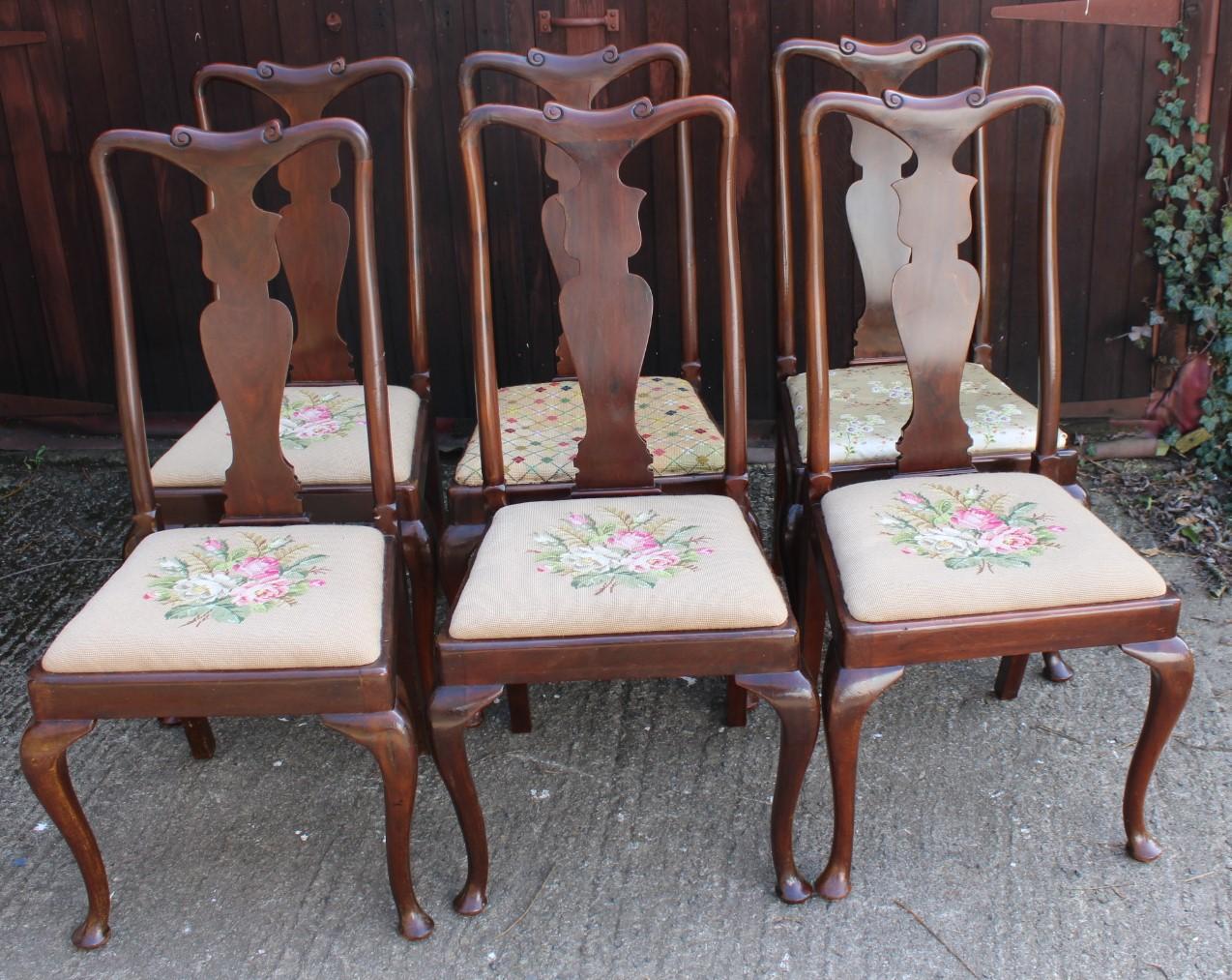1920's Quality Mahogany Set 6 Queen Ann Chairs with Pop Out Seats