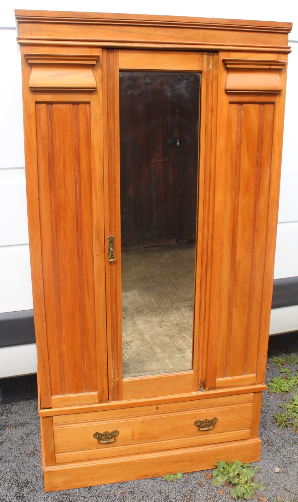 1920s Satin Walnut One Door Mirrored Wardrobe with Base Drawer