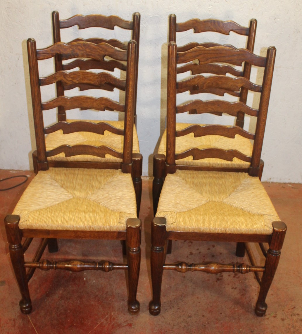 1920s Set of 4 Medium Oak Ladderback Chairs with Rush Seats