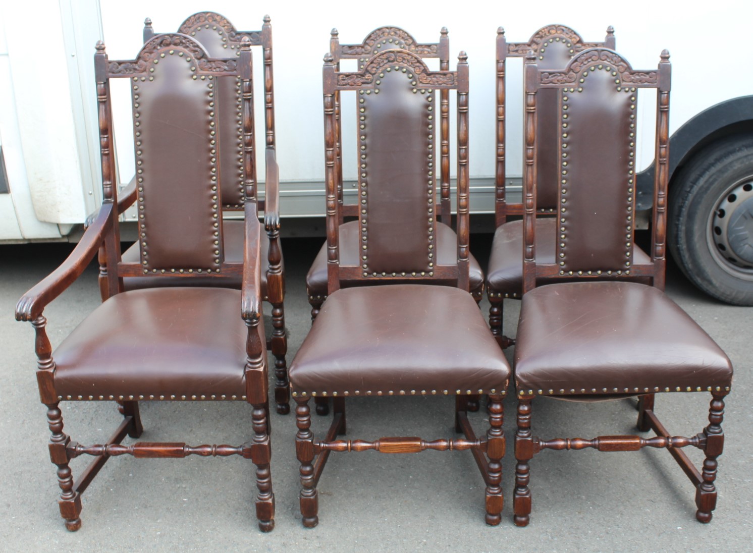 1920s Set of 6 Oak Highback Dining Chairs with Leather Seats, 4 Plus 2 Carvers