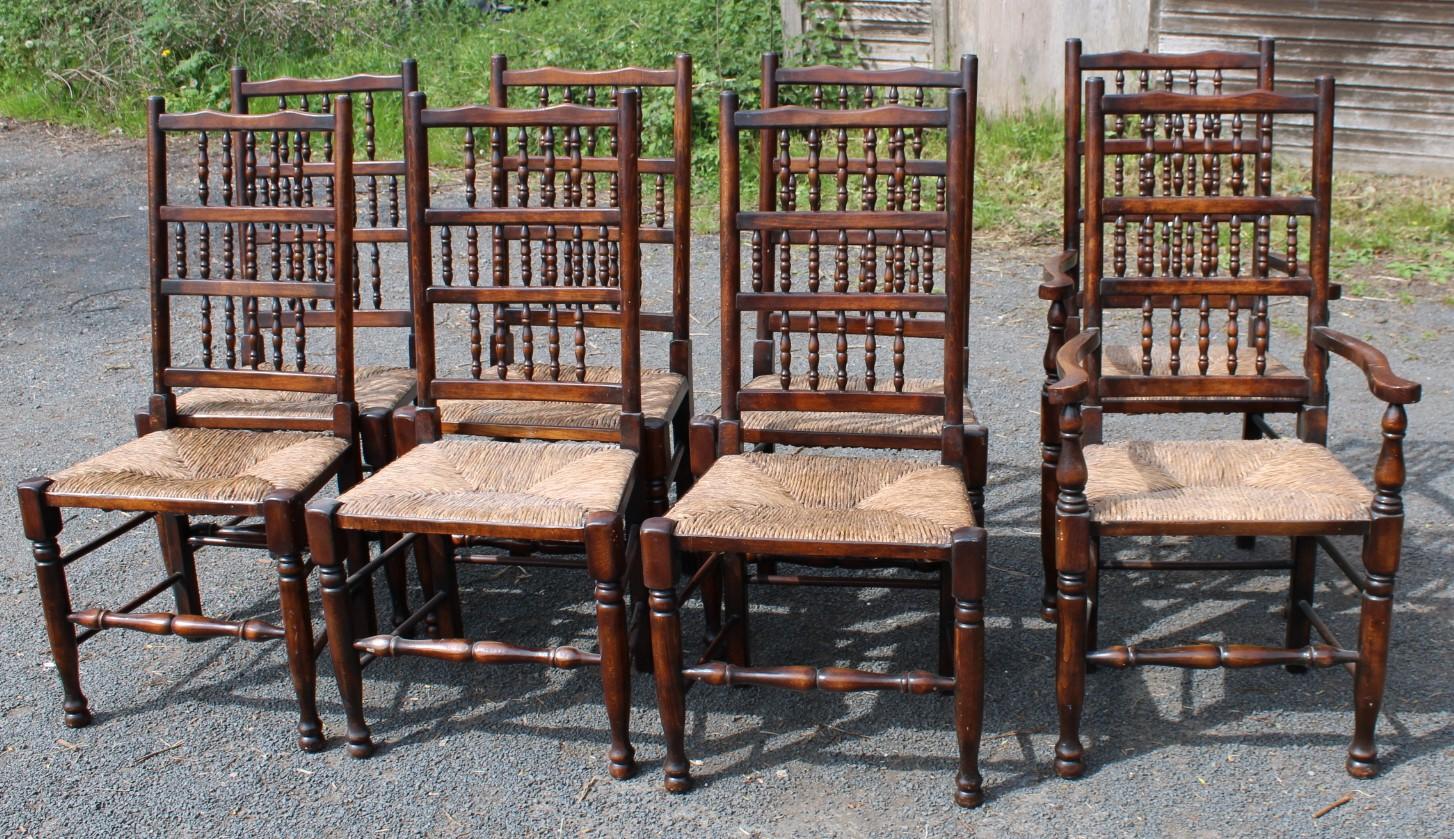 1920s Set of 8 Ash Spindleback Dining Chairs with Rush Seats. 6+ 2 Carvers