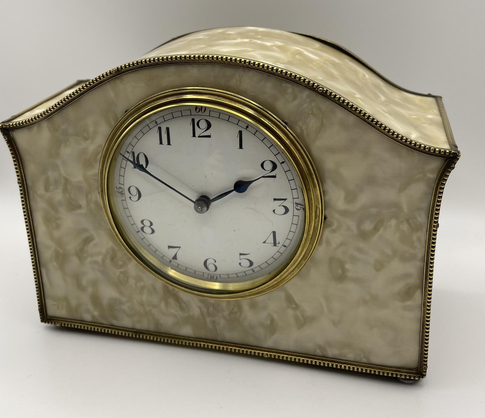 An early 20th Century mantel clock its case with a "pearlised" finish and brass edging. French 8 day movement running well and keeping good time.