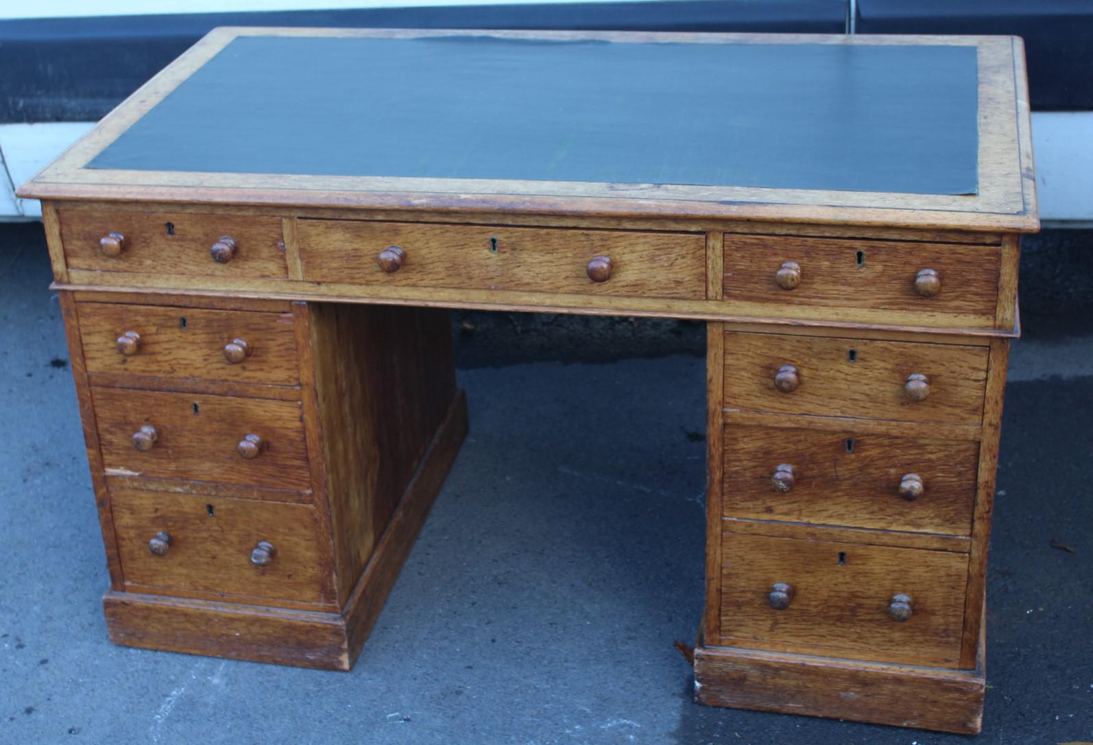 1920's Solid Light Oak Pedestal Desk with Green Leather Top.