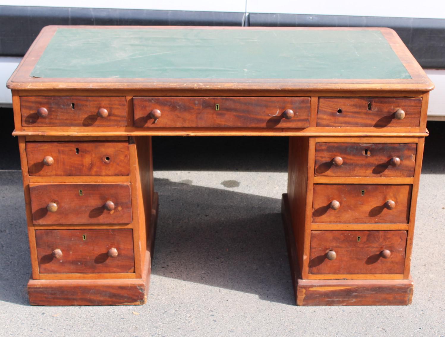 1920s Solid Mahogany Pedestal Desk with Green Top
