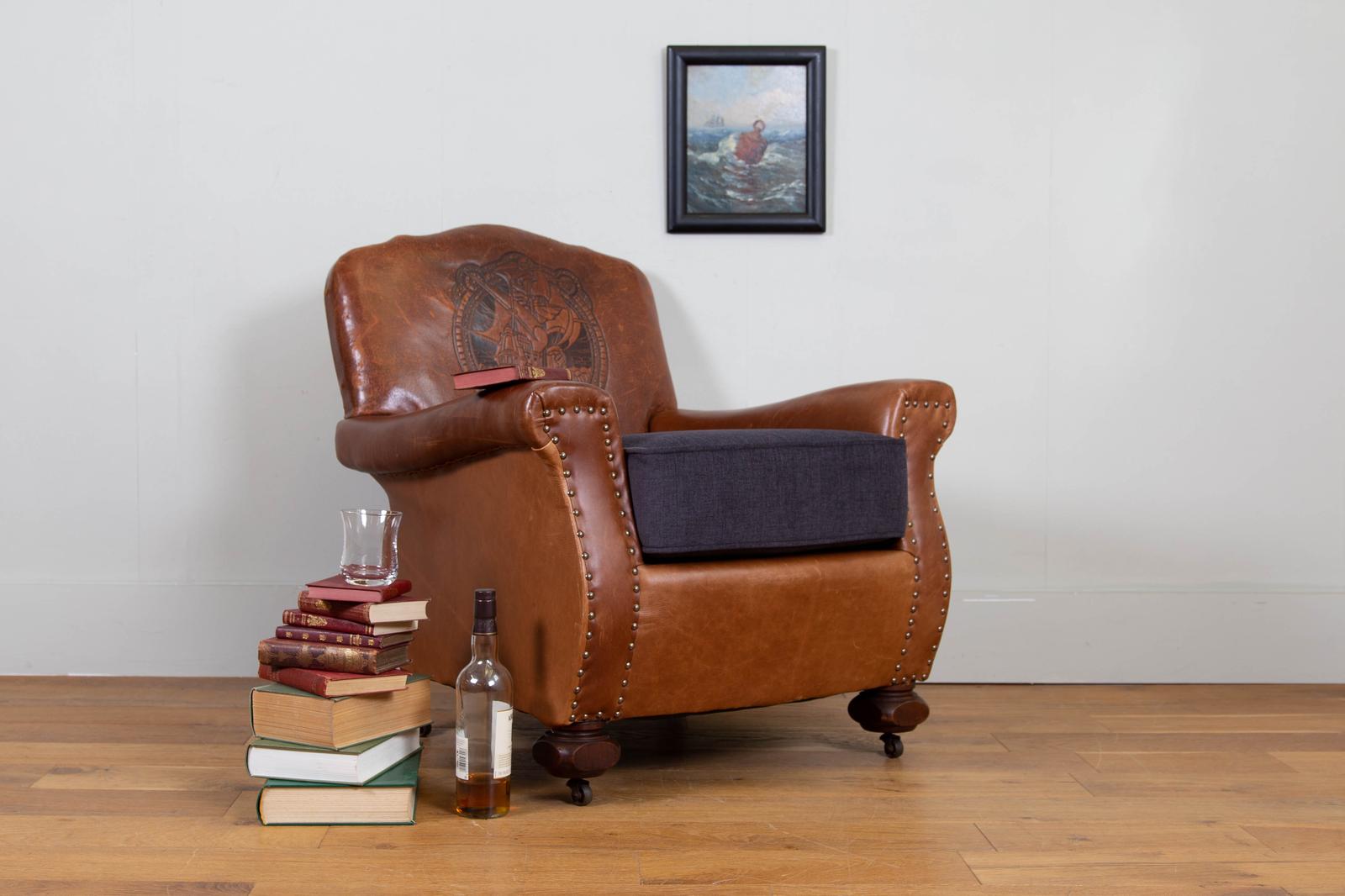 1920s Vintage Leather Armchair with Embossed Ship Design (1 of 13)