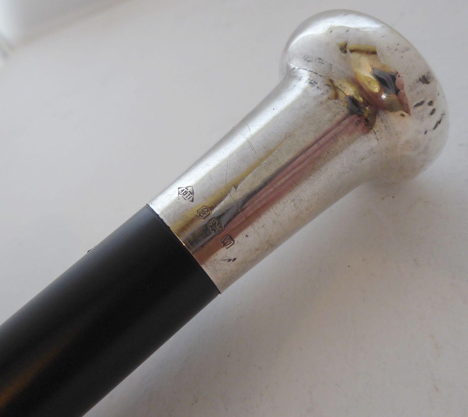 1921 Walking Stick Cane Hallmarked Solid Silver Pommel Ebony Wood Shaft