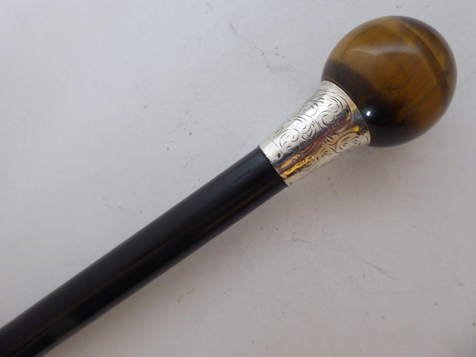 1922 Walking Stick Cane Hallmarked Silver Collar Ebony Wood Shaft Tigers Eye Top